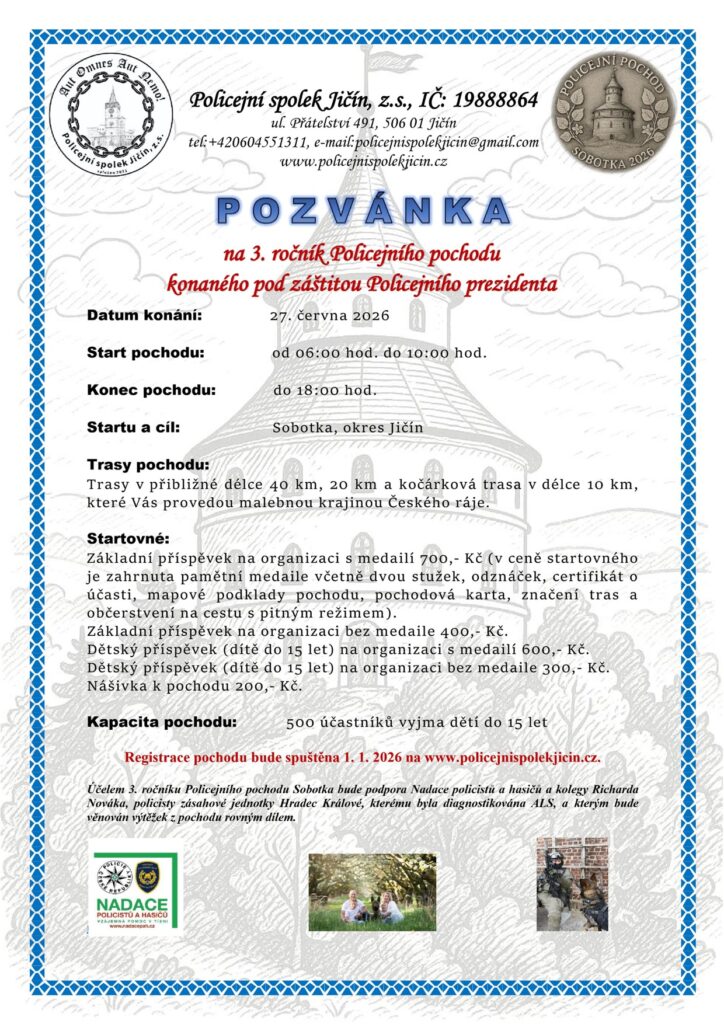 Výtěžek z Policejního pochodu Sobotka 2026 jsme se proto rozhodli rozdělit rovným dílem. Polovina výtěžku půjde na podporu Nadace policistů a hasičů, která dlouhodobě pomáhá rodinám příslušníků, jež zasáhla tragédie, a kterou jsme podpořili již ve druhém ročníku našeho pohodu a druhá polovina bude věnována Richardovi Novákovi a jeho rodině, na financování zdravotní péče, pomůcek, úprav domácnosti a zabezpečení jeho dvou malých synů.